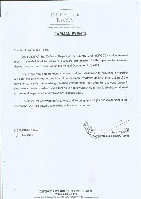 The popularity of fireworks is increasing day by day. Farman Fireworks is one of the most popular fireworks company, providing services in all over Pakistan. We prove our experties on many occasions that includes Indoor, Outdoor, wedding and corporate events as well as we also provide services for Government sector events, opening and closing ceremonies.